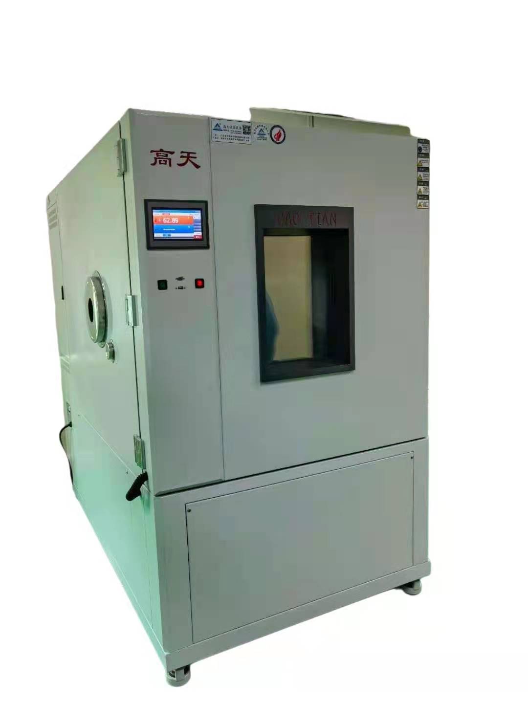 恒定高低溫試驗箱試驗室結構設計合理,配套產品和功能元器件具有專業(yè)的技術,能夠適應長期、穩(wěn)定、安全、可靠的生產需求。能夠滿足用戶為從事上述用途的加工生產要求,且使用、操作、維修方便,使用壽命長,造型美觀,有良好的用戶界面,使用戶的操作和監(jiān)測都更加簡單和直觀。(湖北高天)采用4.風力恒溫系統(tǒng);風力管道系統(tǒng)符合《通風與空調工程施工質量驗收規(guī)范》GB50243-2002標準,通常采用循環(huán)系統(tǒng)、加熱系統(tǒng)和超溫排風系統(tǒng)組成。循環(huán)系統(tǒng)、超溫排風系統(tǒng)、加熱系統(tǒng)及配套的風道系統(tǒng)部分循環(huán)系統(tǒng)采用循環(huán)風機和配套風管進行循環(huán),可保證測試區(qū)內溫度勻,加熱系統(tǒng)采用電熱器加熱,加熱器放置于老化房頂上循環(huán)風道中,四周加防火隔熱材料。采用PID溫度模塊控制,溫度到達產品所需要溫度后根據(jù)室內溫度波動自動調節(jié)加熱器功率大小配合保溫庫板的保溫性,使室內溫度精確穩(wěn)定在所設定溫度數(shù)值可在指定的時間內內將室溫加至設定度,當溫度升至設定值時加熱器停止加熱.加熱器具有過熱保護裝置。用低噪音風機排風,循環(huán)控溫過程:當開機時加熱器開始加熱 溫度到達設定值時加熱器停止加熱,在老化產品的過程中始終保持循環(huán)狀態(tài),以保證溫度均衡。整套系統(tǒng)動作具有性能穩(wěn)定,控制精確、溫度波動小,均衡度高、噪音小等特點。