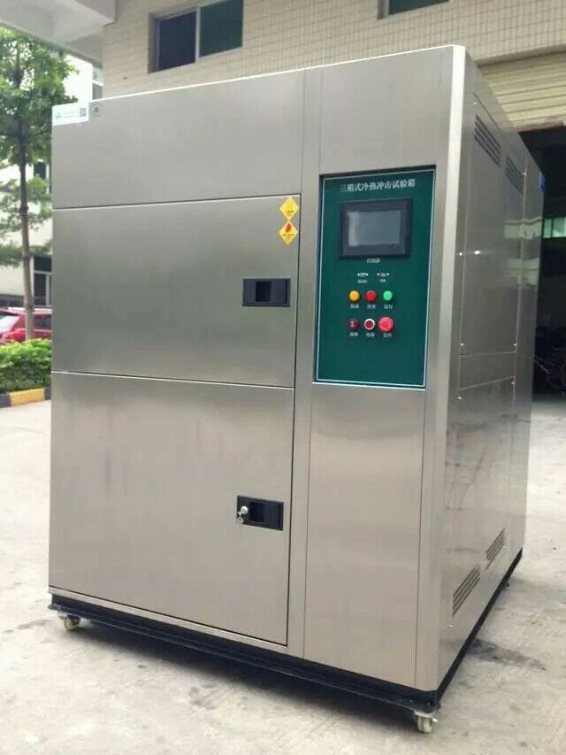 三箱式溫度沖擊試驗箱整體結(jié)構(gòu),試樣物品完全靜止試驗箱由預(yù)熱室、預(yù)冷室、工作室、制冷系統(tǒng)、加熱系統(tǒng)、風(fēng)道系統(tǒng)、電器控制系統(tǒng)組成。工作室位于試驗箱中部,高溫室位于試驗箱下部,低溫室位于試驗箱上部,制冷機系統(tǒng)位于試驗箱的后下部,電器控制柜位于試驗箱右側(cè)面上部。